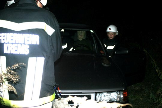Der Fahrer des zweiten PKW saß noch im Fahrersitz angeschnallt. Die Jugendlichen konnten die Fahrertüre schnell ohne hydraulischen Rettungssatz leicht öffnen. Die bewustlose Person wurde mittels Rautek-Griff schonend aus dem Fahrzeug befreit und an die Sanitätskräfte übergeben. Der schonende Transport über die Böschung gestaltete sich zusätzlich als schwierig.