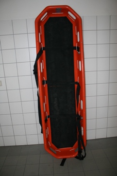 Diese Trage dient zum schonenden Transport von verunglückten Menschen. Man kann damit Personen ganz normal tragen, über eine Böschung ziehen, oder mit einem Lastkran aus einem Schacht heben.