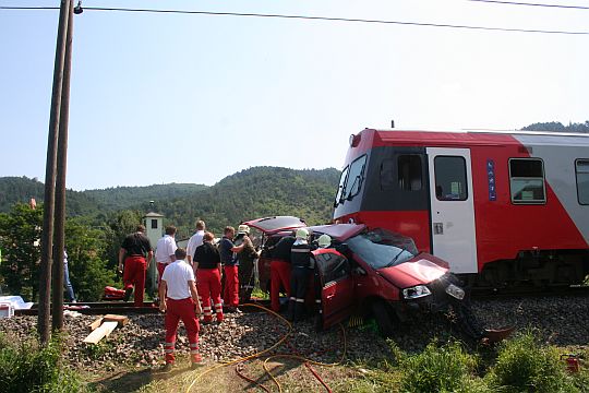Am Einsatzort bot sich folgendes Bild: Ein Personenzug hatte einen PKW erfasst und ca. 100 Meter mitgeschleift. Es befanden sich fünf Personen im Fahrzeug, wobei drei rasch befreit werden konnten, aber zwei Personen im Fahrzeug schwer eingeklemmt wurden.