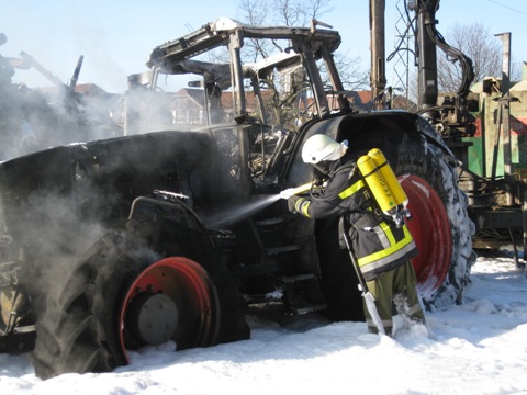 Beim Eintreffen der Feuerwehr stand der Traktor bereits in Vollbrand, eine schwarze Rauchsäule war kilometerweit zu sehen.