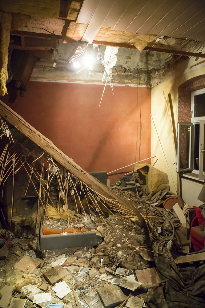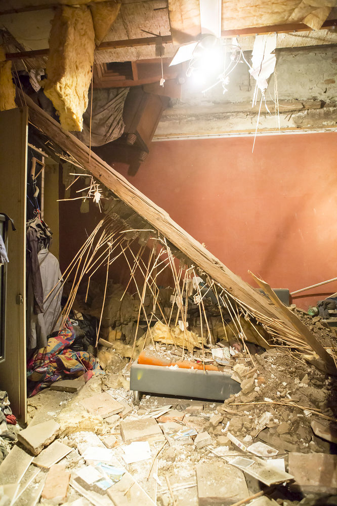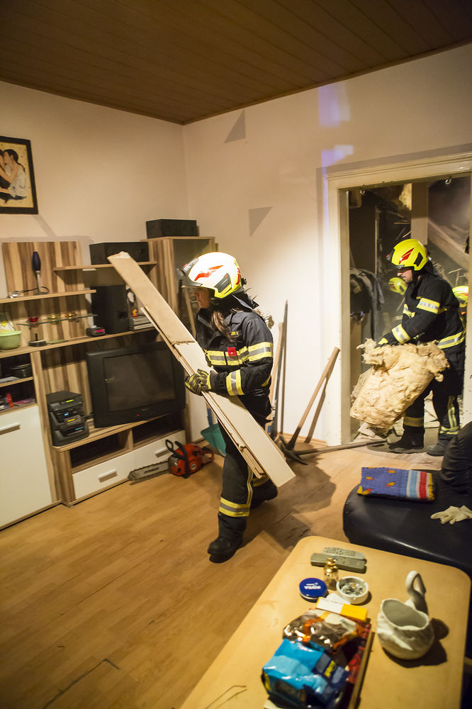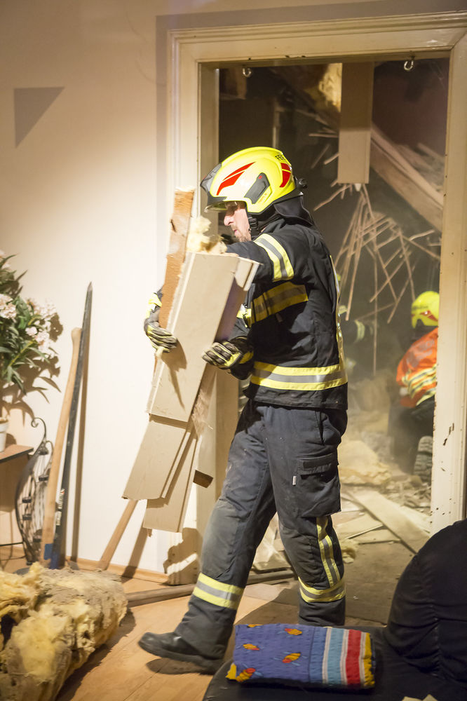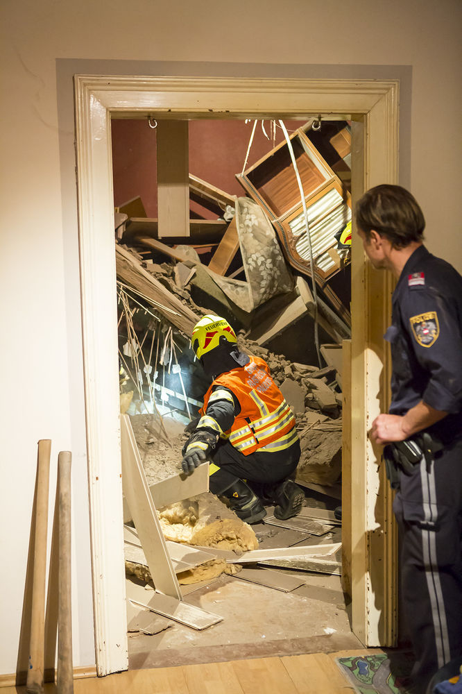 Aus noch unbekannter Ursache gab die Holztramdecke des Gebäudes nach und stürzte in das daruntergelegene Schlafzimmer des Hauses. Eine Person, welche im Bett lag wurde von den Trümmern verschüttet. Die Einsatzkräfte stützten die noch oben hängenden Deckenteile ab, damit nicht noch mehr herunterfällt, und räumten den Schutt zur Seite. Anschließend konnte sich der Mann glücklicherweise mit eigenen Kräften aus seiner misslichen Lage befreien. Er wurde mit Verletzungen unbestimmten Grades dem anwesenden Notarztteam übergeben.