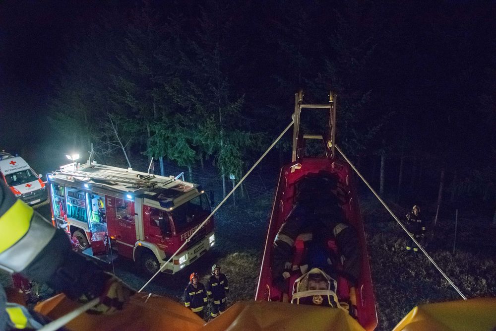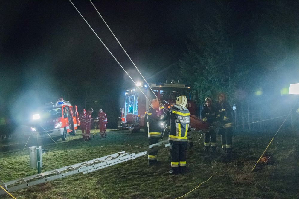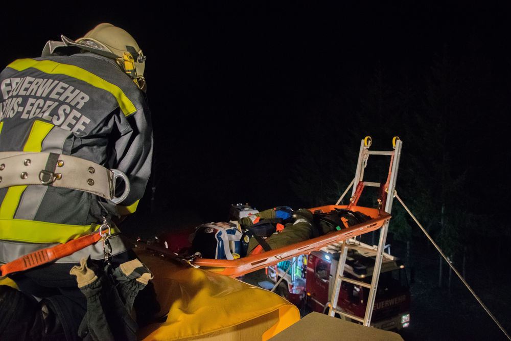 Hierzu wurde die Trage auf der einen Seite doppelt am oberen Ende der Leiter befestigt und auf der gegenüberliegenden Seite mit zwei Rettungsleinen zum Ablassen gesichert. Beide Rettungsleinen wurden mit Abseilachter und Prusikknoten geführt, um ein kontrolliertes Ablassen zu ermöglichen. Durch langsames und kontrolliertes Umlegen der Leiter konnte die verunfallte Person schonend und schnell von der Warte gerettet und dem Rettungsdienst zur weiteren Versorgung übergeben werden.