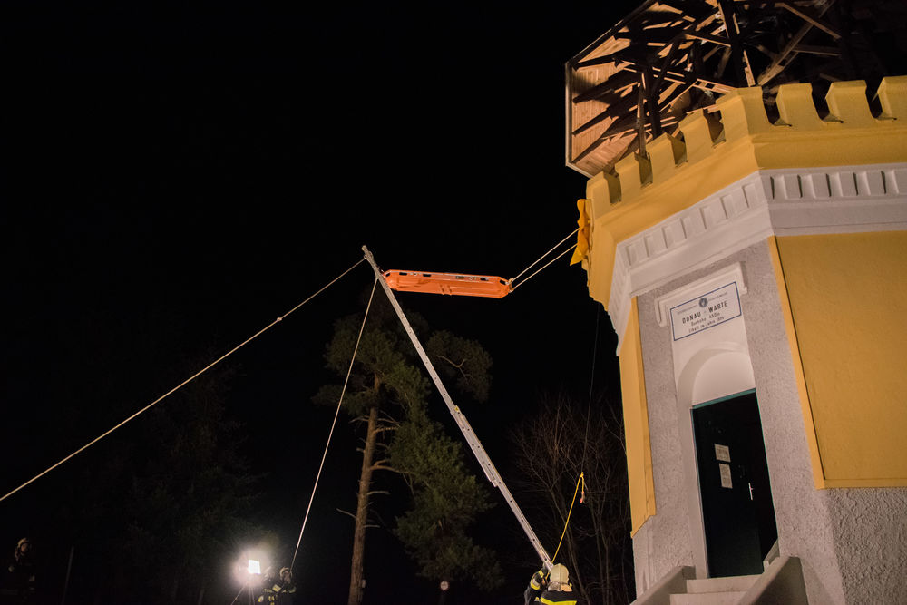 Auf der Donauwarte war eine Person zu Sturz gekommen und musste, nach Absprache mit dem anwesenden Rettungsdienst, liegend und möglichst schonend von der Warte gerettet werden. Da die enge Wendeltreppe dies nicht erlaubte, wurde von dem Einsatzleiter entschieden, den Verunfallten mittels Korbschleiftrage und Leiter mit der sogenannten „Leiterhebel-Technik“ zu retten.