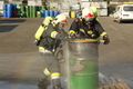 Die Einsatzkräfte wurden von einem Einweiser, welcher den genauen Standort des Brandobjektes am Areal, sowie die ungefähre Angabe vom Inhalt - "Laborabfälle" bekanntgab, empfangen. Bei der Erkundung des Einsatzleiters konnte dieser die Gefahrenkennzeichnungen brennbar, giftig sowie ätzend an dem brennenden Fass erkennen. Da es sich laut Aussagen von Mitarbeitern im Regelfall bei dem Inhalt um viele verschiedene Chemikalien in Form von Lacken, Lösemitteln aber auch Putz- und Reinigungsmitteln handelt und nicht sicher gesagt werden konnte, welche Stoffe sich tatsächlich im betroffenen Fass befinden, wurde ein Atemschutztrupp mit dem Kühlen des Fasses und der Umgebung aus sicherer Entfernung beauftragt.