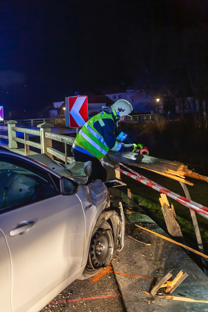 Dort angekommen, wurde die Straße abgesichert, um ein gefahrloses Arbeiten der Einsatzkräfte zu gewährleisten. Der Gruppenkommandant des ersteintreffenden Fahrzeuges erkundete währenddessen die Lage. Aus bisher ungeklärter Ursache verlor der Lenker die Kontrolle über sein Fahrzeug, welches somit gegen ein Geländer krachte und es durchstieß.