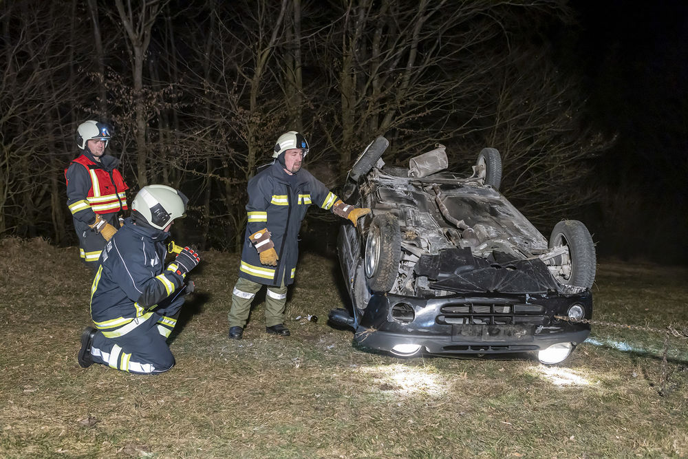 Zu einem Verkehrsunfall auf der L109 in Fahrtrichtung Oberbergern wurde am Abend des 8. Februar 2023 die Freiwillige Feuerwehr Schenkenbrunn alarmiert. In einer Linkskurve kam ein Kleinwagen rechts von der Straße ab und hat sich überschlagen. Der Pkw kam am Dach liegend einige Meter unterhalb der Straße zum Stillstand.