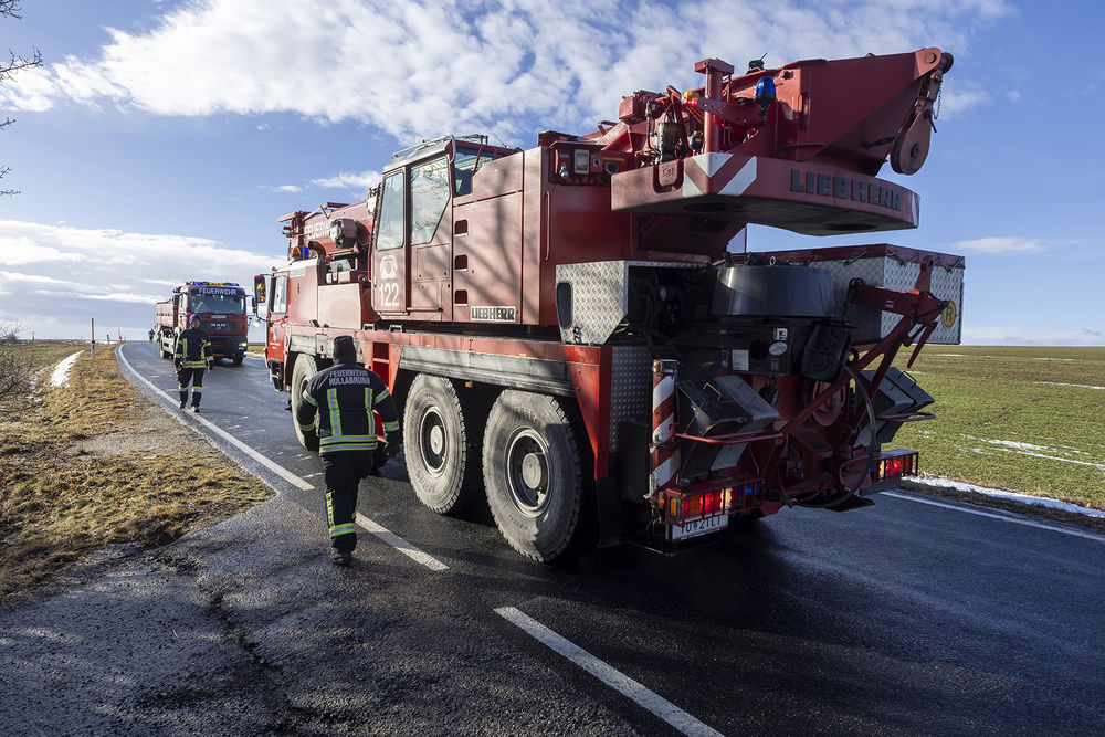 Nach Einteilung der Mannschaft und Vorbereitung des Krans und des Begleitfahrzeugs der Feuerwehr Krems, begann die Fahrt in den Bezirk Horn. Nach über einstündiger Fahrt erreichte die Crew den Unfallort. Zu diesem Zeitpunkt war bereits das Kranfahrzeug der Feuerwehr Hollabrunn in Stellung gebracht und die Rundschlingen zur Bergung des Räumfahrzeuges befestigt worden.