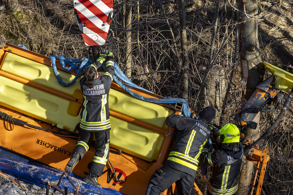 Da sich der LKW in Seitenlage befand, musste dieser noch auf die Räder gestellt werden. Nachdem dies bewerkstelligt war, konnte das Fahrzeug auf den bereitgestellten Tieflader verladen werden. Das Kremser Kranfahrzeug positionierte sich dazu neu, und mittels Rundschlinge wurde das Straßenmeistereifahrzeug mit der Seilwinde des Krans verbunden. In Absprache mit einem Einweiser der Feuerwehr, wurde das Streufahrzeug auf dem Anhänger gezogen.