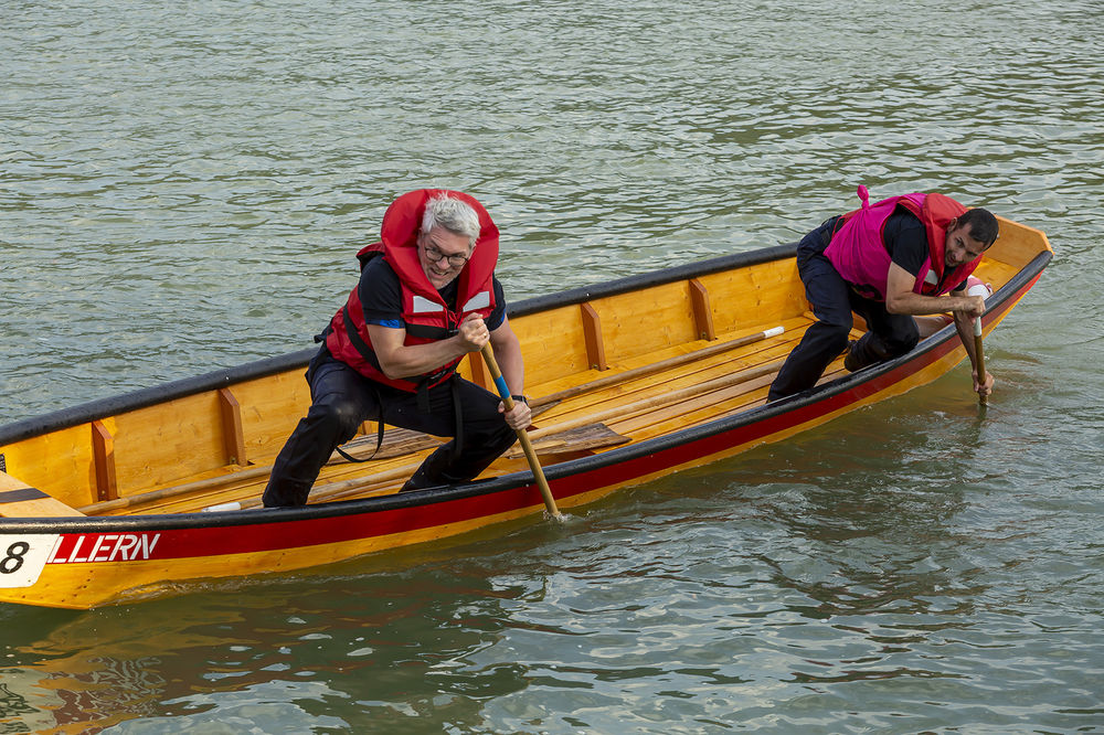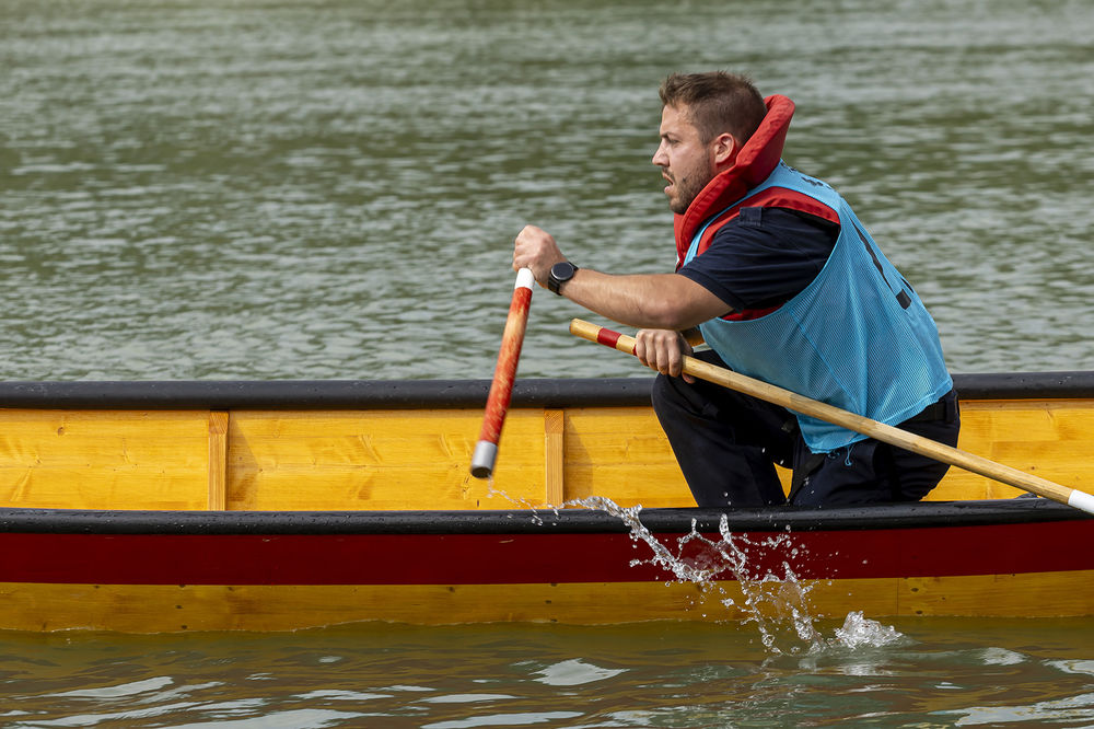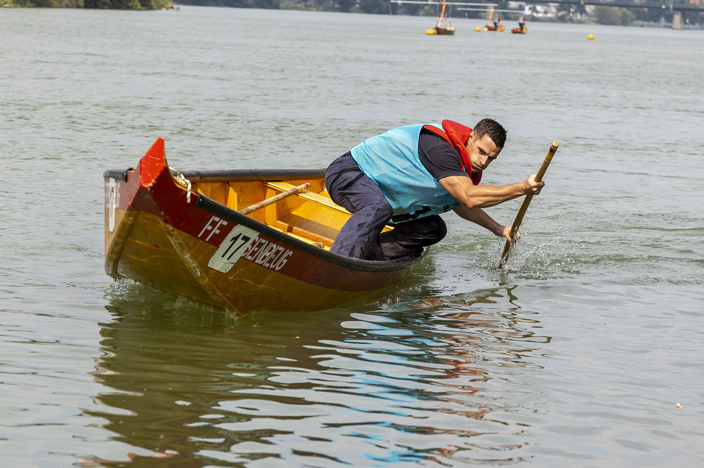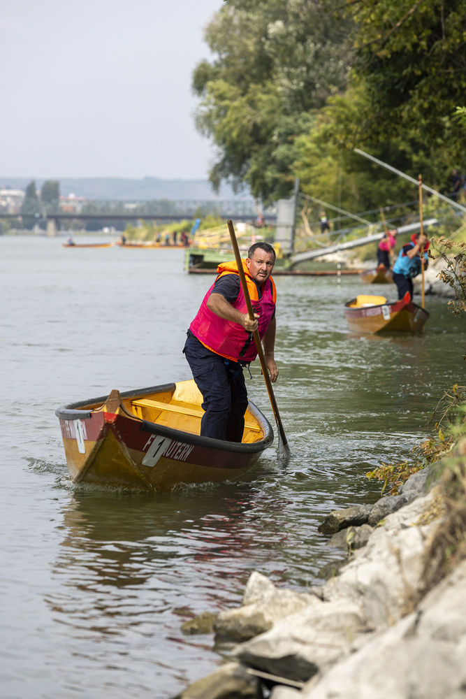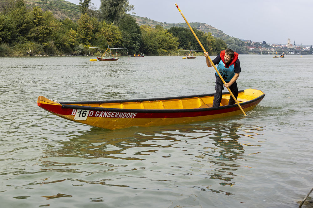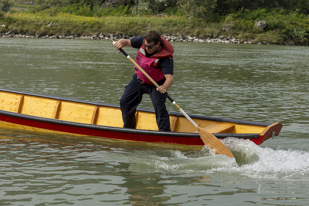 Teilnehmer, die beim Bezirkswasserdienstleistungsbewerb in Mauternbach alleine in ihren Holzzillen unterwegs waren, mussten 600 Meter zurücklegen, Zweierbesatzungen 800 Meter. Vom Start bis zur Wendeboje mussten vier Tore passiert werden. Außerdem war zwischen der dritten und vierten Boje ein sogenanntes Schwimmholz aufzunehmen, das sicher ins Ziel gebracht werden musste. „Eine besondere Herausforderung war, dass die Schubstangen nicht durchgehend eingesetzt werden konnte, sondern ein Stück der Strecke mit dem Ruder zurückgelegt werden musste“, sagt der stellvertretende Bezirksfeuerwehrkommandant Engelbert Mistelbauer – er ist im Bezirksfeuerwehrkommando Krems für das Bewerbswesen zuständig.