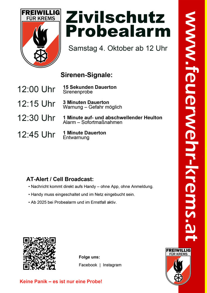 Am Samstag, den 4. Oktober 2025, wird der bundesweite Zivilschutz-Probealarm durchgeführt. Zwischen 12.00 und 12:45 Uhr werden nach dem Signal "Sirenenprobe" die drei Zivilschutzsignale "Warnung", "Alarm" und "Entwarnung" in ganz Österreich ausgestrahlt. Der Probealarm dient einerseits zur Überprüfung der technischen Einrichtungen des Warn- und Alarmsystems, andererseits soll die Bevölkerung mit diesen Signalen vertraut gemacht werden.