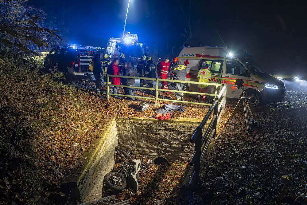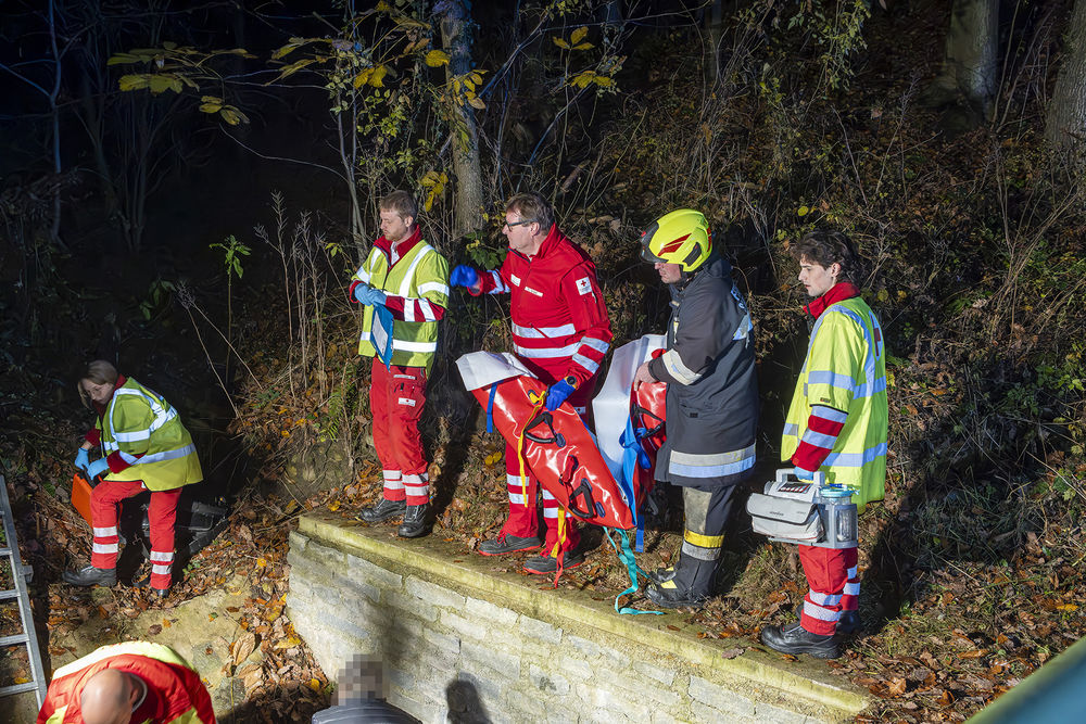 Während die Feuerwehr eine Beleuchtung aufbaute, verschafften sich die Einsatzkräfte mittels Steckleitern einen Zugang zum Verletzten. Nachdem das Rote Kreuz und der Notarzt den Patienten erstversorgt hatten, konnte dieser mittels Korbschleiftrage aus dem Wasserauffangbehälter gerettet werden. Anschließend wurde der Motorradfahrer auf die Krankentrage umgelagert und in den vorgeheizten Rettungswagen gebracht.