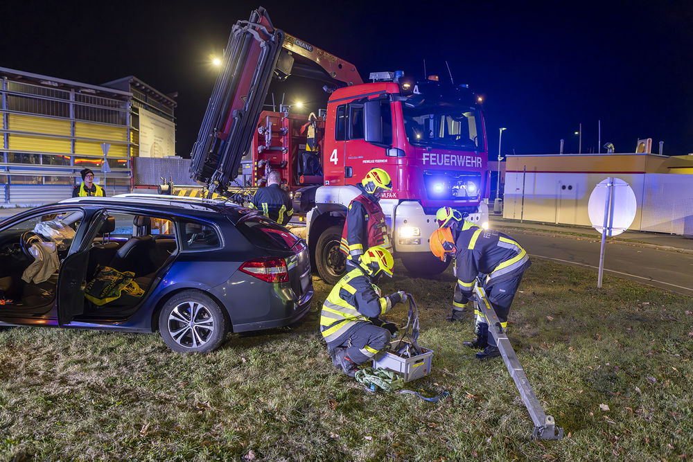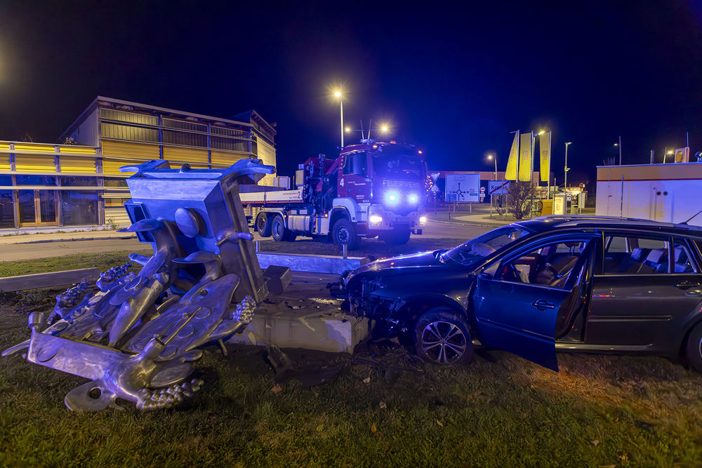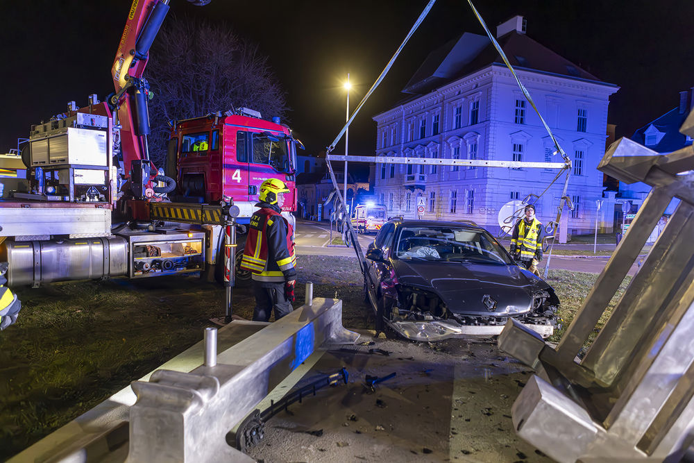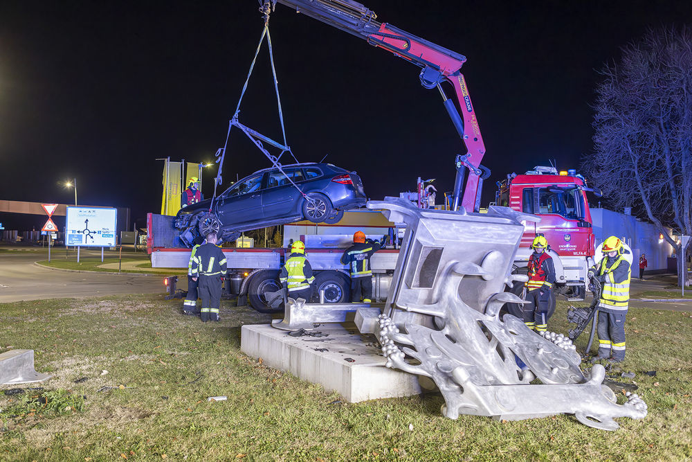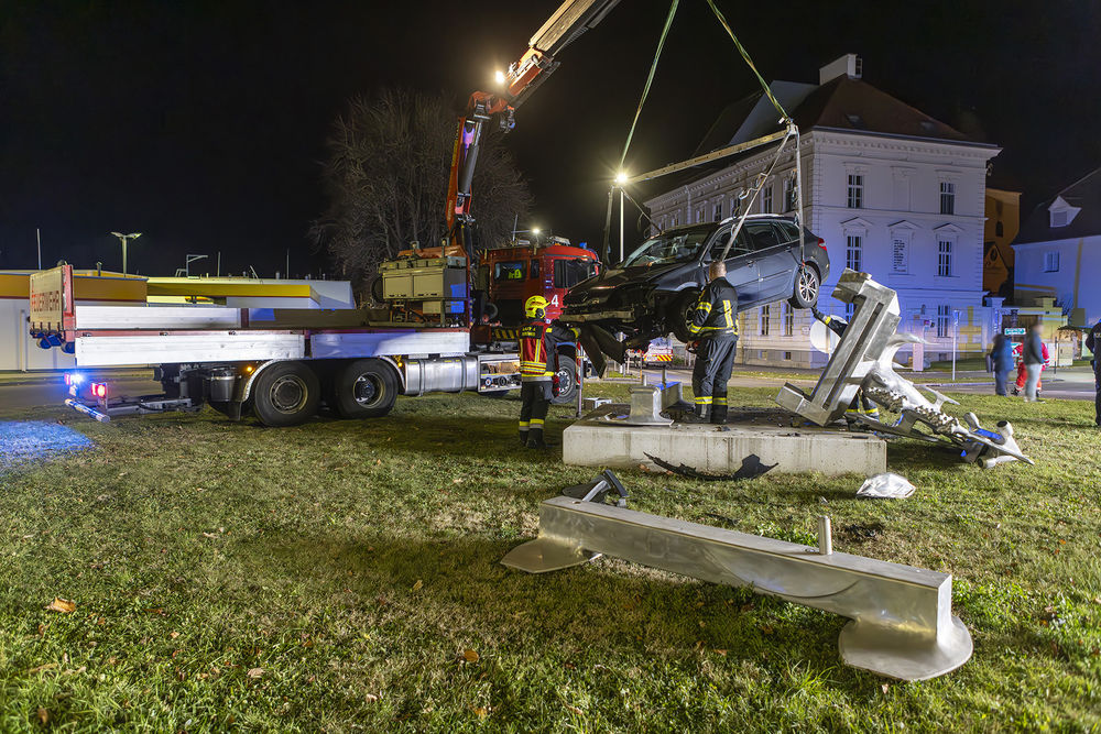 Bereits in der darauffolgenden Nacht alarmierte der Diensthabende die Hauptwache zum nächsten Einsatz. Ein PKW krachte beim Kreisverkehr bei der Landesgalerie in die Skulptur und musste geborgen werden.