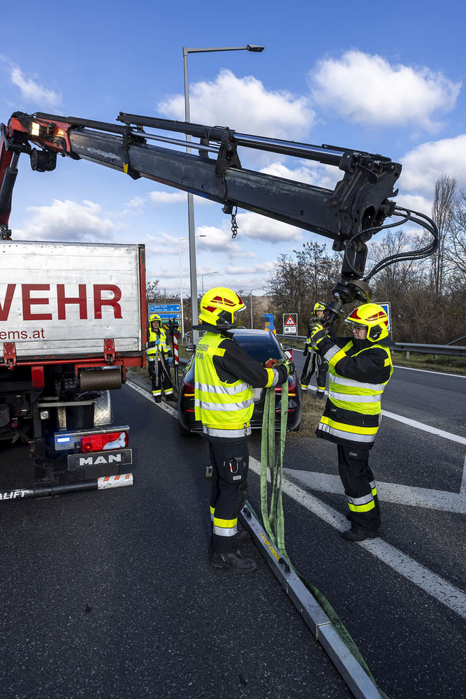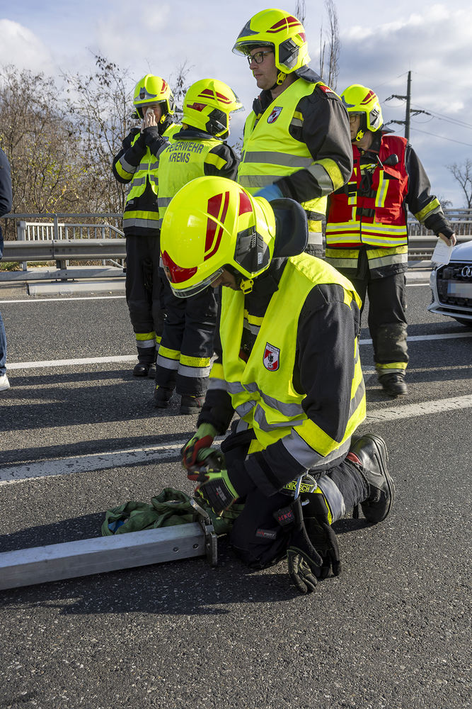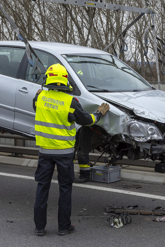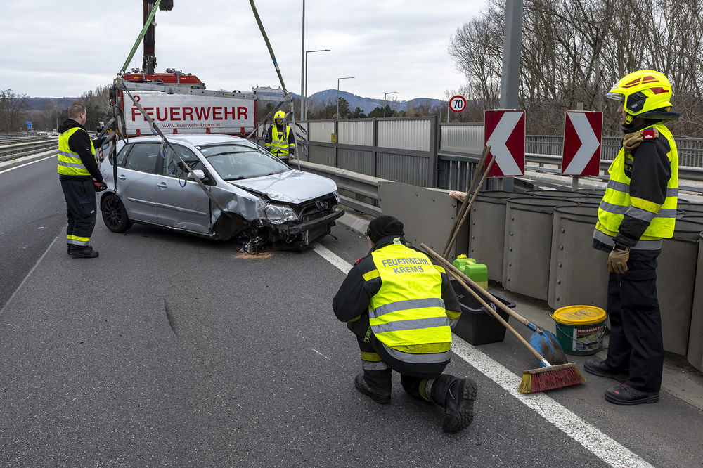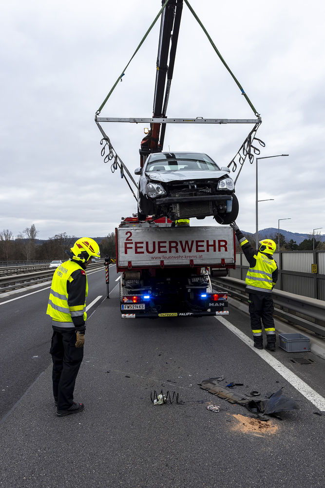 Nur zwei Stunden nach dem Einrücken wurde die Hauptwache zu einer weiteren Fahrzeugbergung alarmiert. Auf der Donaubrücke in Fahrtrichtung Zwettl krachte ein PKW gegen eine Leitschiene und blieb darauf hängen. Die Feuerwehr Krems barg auch dieses Fahrzeug mittels des Krans vom Wechselladefahrzeug. Das Fahrzeug setze selbstständig die Fahrt fort.