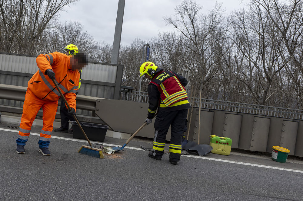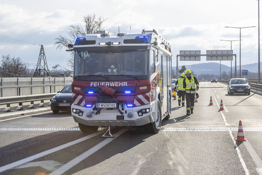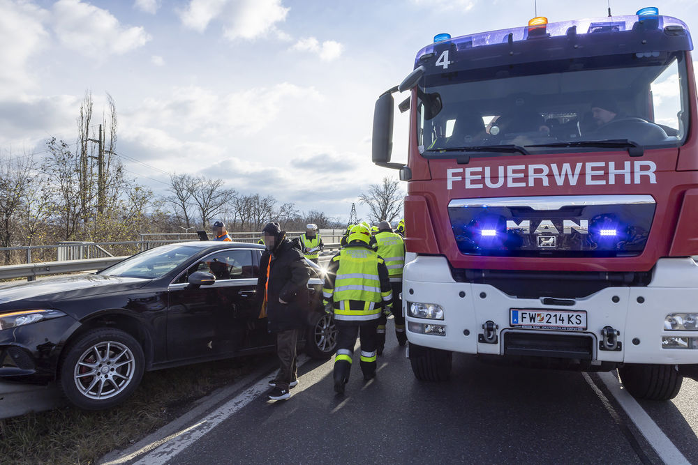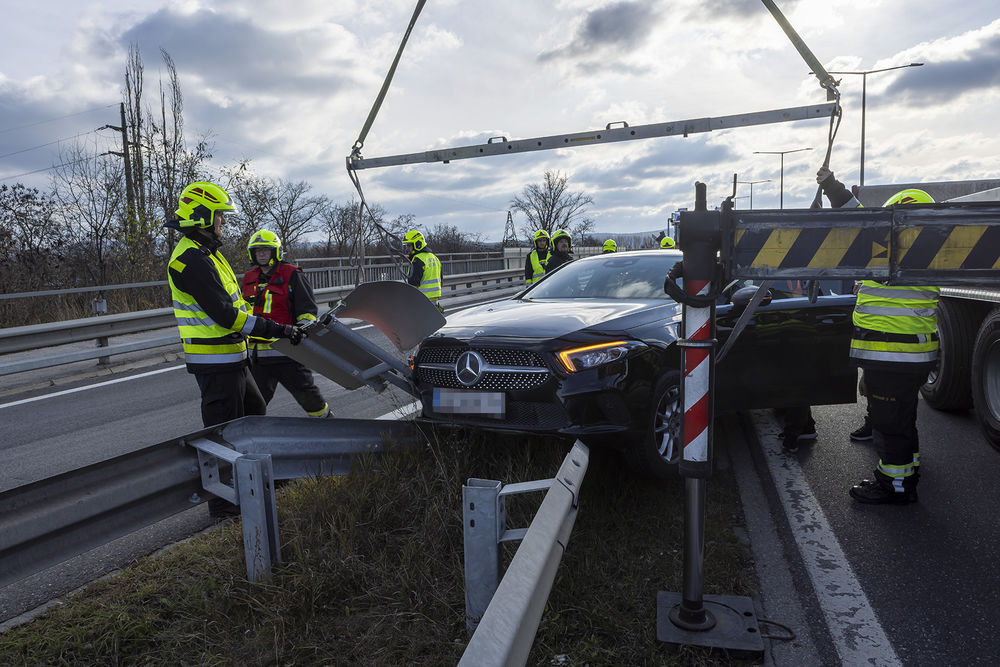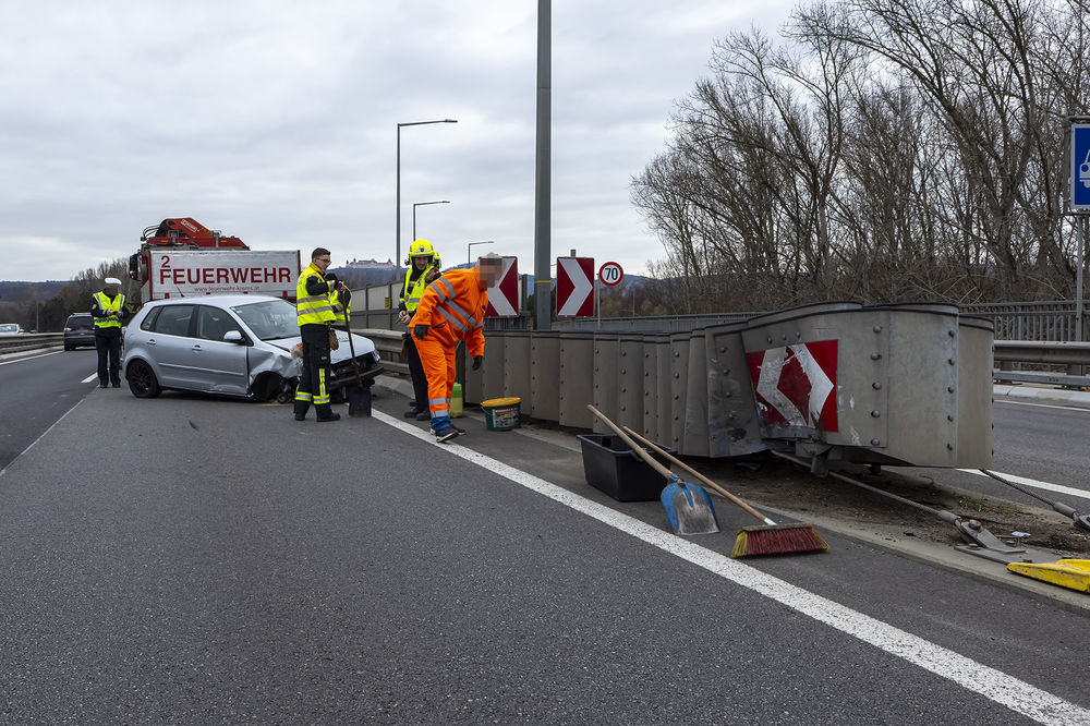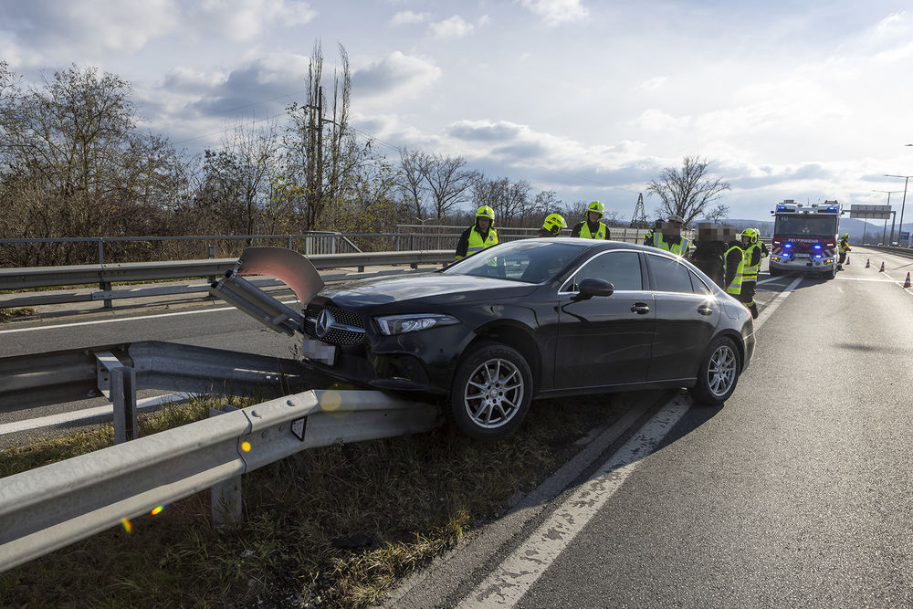 Nur zwei Stunden nach dem Einrücken wurde die Hauptwache zu einer weiteren Fahrzeugbergung alarmiert. Auf der Donaubrücke in Fahrtrichtung Zwettl krachte ein PKW gegen eine Leitschiene und blieb darauf hängen. Die Feuerwehr Krems barg auch dieses Fahrzeug mittels des Krans vom Wechselladefahrzeug. Das Fahrzeug setze selbstständig die Fahrt fort.