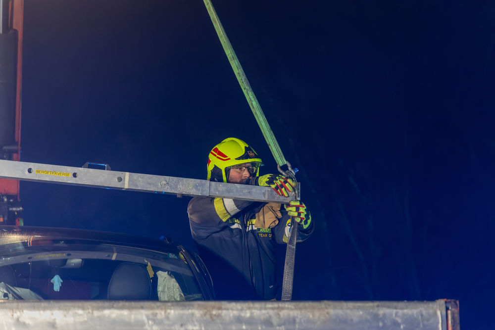 Beim Eintreffen der Hauptwache am Einsatzort wiesen die Einsatzkräfte das Wechselladefahrzeug ein. Nachdem Last 4 Krems in Position gebracht wurde, konnte mit der Bergung begonnen werden. Gemeinsam mit der Feuerwehr Gedersdorf haben die Kremser mittels des Hebebalkens über den Kran das Unfallfahrzeug auf das Bergeplateau gehoben.