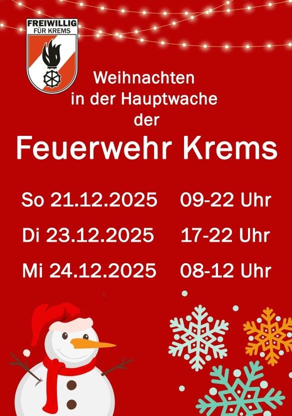 Auch dieses Jahr laden die ehrenamtlichen Mitglieder der Hauptwache Sie herzlich ein, gemeinsam Weihnachten vorzufeiern. In gemütlicher Runde haben Sie die Möglichkeit, mit einem unserer ehrenamtlichen Mitglieder ins Gespräch zu kommen und die Feuerwehr Krems aus einer anderen Perspektive kennenzulernen. Mehr Infos entnehmen Sie bitte HIER.