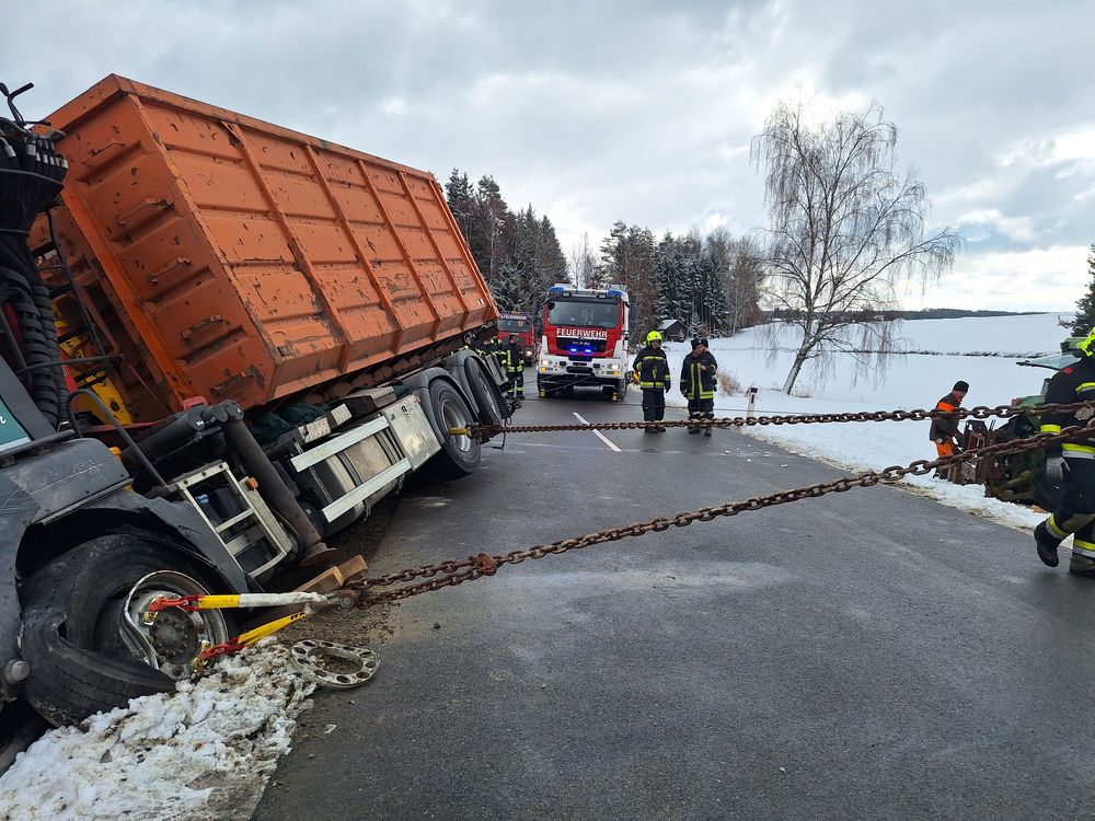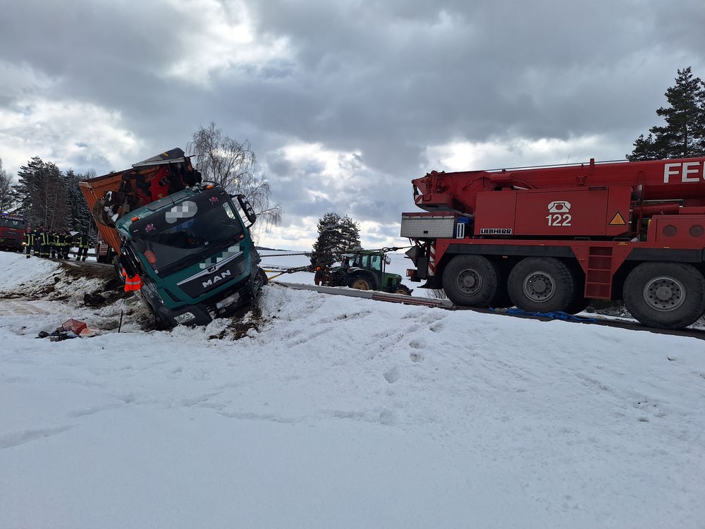 Mithilfe der Seilwinde des Kranfahrzeuges wurde der Lastwagen zunächst wieder auf die Räder gestellt. Anschließend wurde der LKW mit zwei Seilwinden gleichzeitig – jener des Kranfahrzeuges sowie jener des Hilfeleistungsfahrzeuges der Feuerwehr Heidenreichstein – zurück auf die Fahrbahn gezogen. Gesichert wurde das Vorgehen zusätzlich durch die Seilwinde eines Traktors, sodass ein erneutes Umstürzen des LKWs verhindert werden konnte.