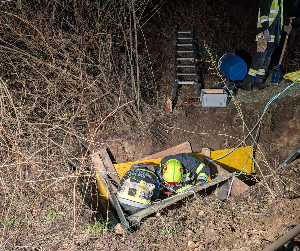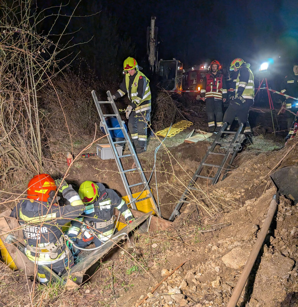 "Bauarbeiter verschüttet und unter Baggerschaufel eingeklemmt." Das war am Freitag, 27.03.2026, die Ausgangslage für eine technische Übung der Feuerwache Egelsee. Das unwegsame Gelände und die Dunkelheit erschwerten die Rahmenbedingungen, unter denen die Einsatzkräfte arbeiten mussten, zusätzlich.