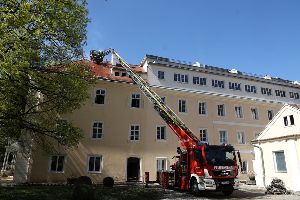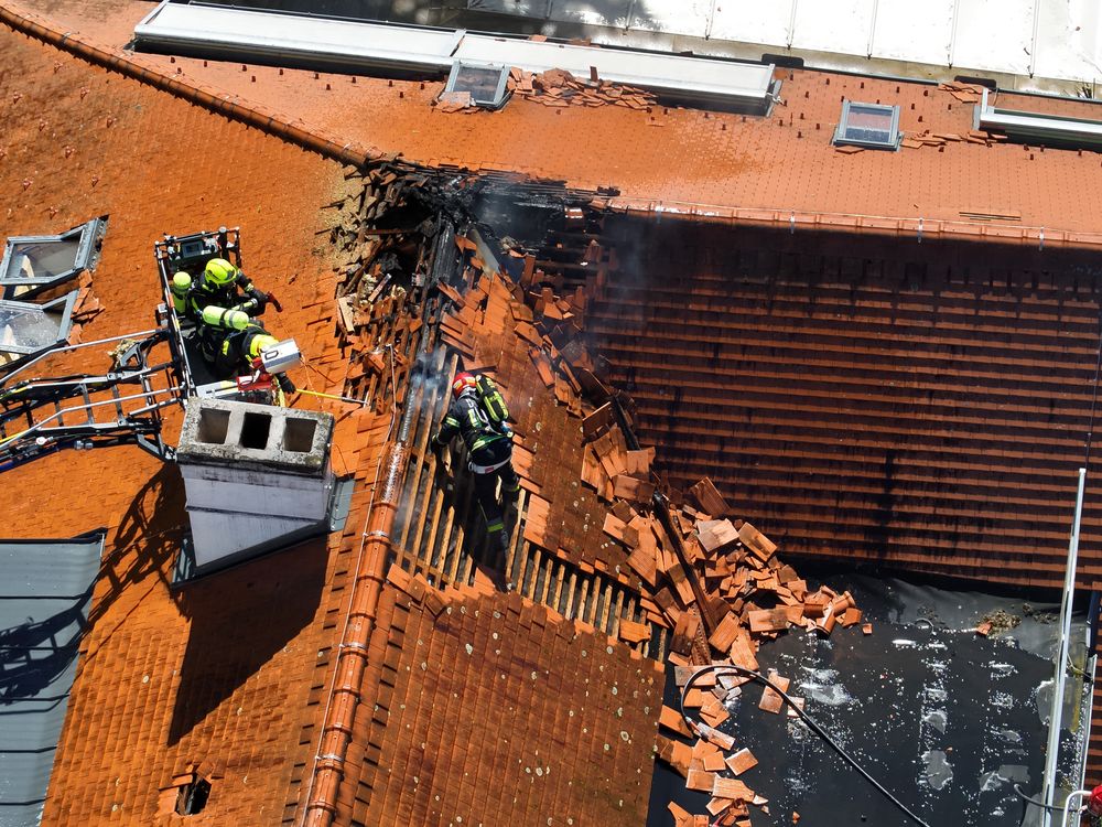 Zu den weiteren Maßnahmen vor Ort zählte das großflächige Öffnen des Daches mittels Motorkettensägen, um Glutnester freizulegen und den Brand gezielt zu bekämpfen. Dieses Vorgehen zeigte rasch Wirkung, sodass der Brand schließlich unter Kontrolle gebracht und abgelöscht werden konnte.