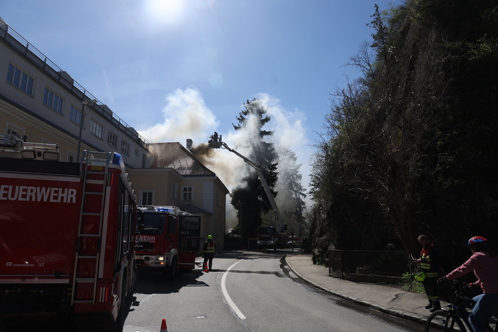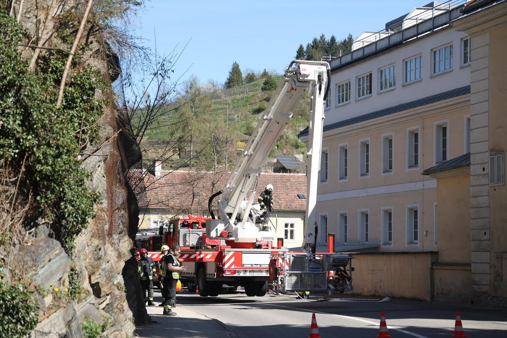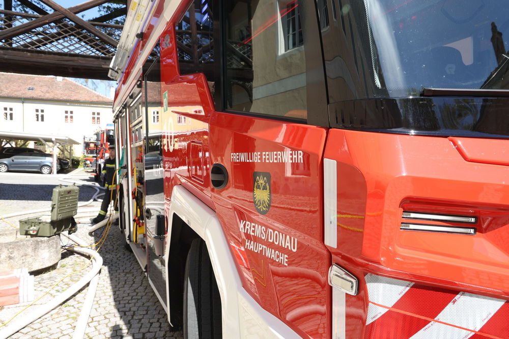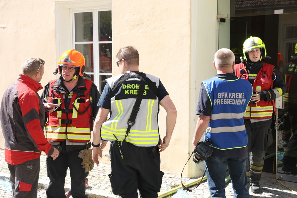 Während der Einsatzleiter die Erkundung durchführte, bereitete ein Atemschutztrupp im Innenhof des Areals eine Löschleitung vor. Rasch gingen die ersten Einsatzkräfte unter Atemschutz in das Dachgeschoss vor, um den Brand zu lokalisieren. Dies gestaltete sich aufgrund der massiven Rauchentwicklung jedoch als schwierig. Daher ließ der Einsatzleiter umgehend die Alarmstufe erhöhen. Es wurden alle Feuerwachen der Feuerwehr Krems zum Brandeinsatz nachalarmiert.