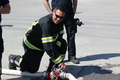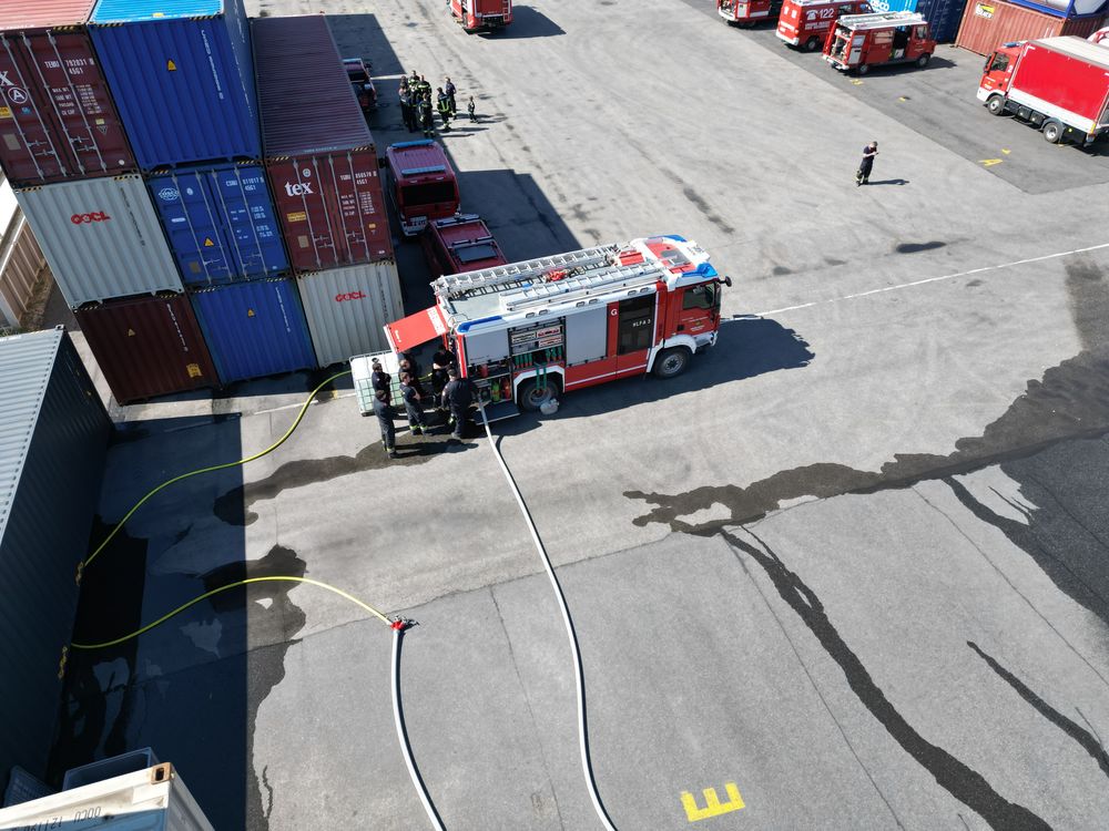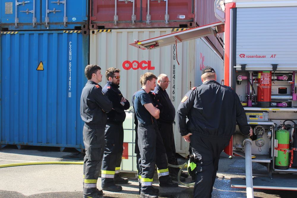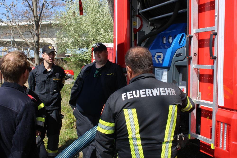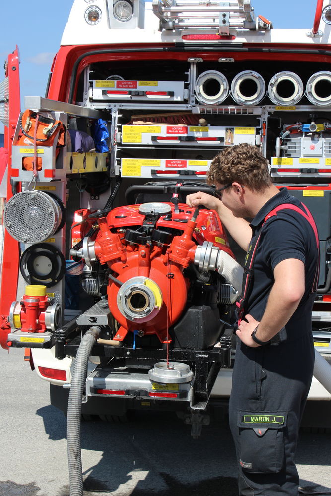 Nach der Mittagspause wurde die Ausbildung am Nachmittag mit einem praktischen Teil fortgesetzt. Im Rahmen eines Stationenbetriebs wurden verschiedene Themenbereiche beübt. Bei der ersten Praxisstation wurde das Verlegen einer Schlauchleitung über eine längere Strecke durchgeführt. Diese wurde sowohl mit der eingebauten Pumpe eines Tanklöschfahrzeuges als auch mit einer Tragkraftspritze betrieben, um den Unterschied in der Förderleistung und im Druckverhalten zu veranschaulichen. Zusätzlich wurde die Drehleiter mit dem Wasserwerfer in Stellung gebracht, wodurch die Teilnehmer die Druckunterschiede und Auswirkungen direkt beobachten konnten. Nachdem die erste Station beübt worden ist konnten die anderen Stationen bewältigt werden. Dabei beschäftigten sich die Teilnehmer mit unterschiedlichen Pumpen- und Schaumbetrieben, verschiedenen Arten der Wasserversorgung, dem Einsatz der Seilwinde sowie dem Waschbalken.
