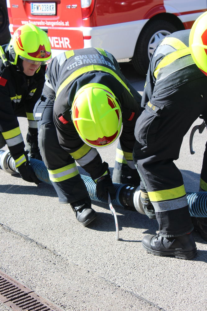 Am vergangenen Samstag war es dann so weit: Die neun Mitglieder der Feuerwehr Krems stellten sich ihren Abschlussmodul. Nach dem schriftlichen Test folgte eine Praxisprüfung, bei der eines von drei verschiedenen Szenarien abgearbeitet werden musste. Dabei handelte es sich entweder um das Aufstellen einer Schiebeleiter mit anschließendem Hochziehen der Löschleitung, das Absichern einer Unfallstelle inklusive Aufbau einer Beleuchtung und Brandschutzes oder um den Aufbau einer Saugleitung.