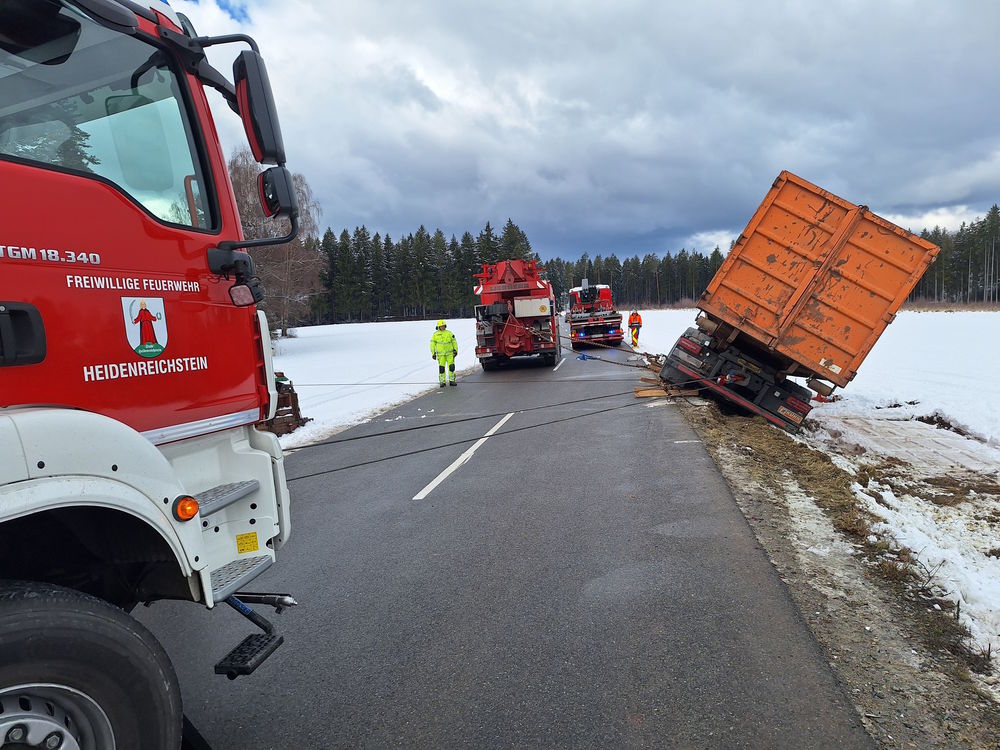 Freitag, 30. Jänner 2026 LKW Bergung nach Verkehrsunfall in Gastern (WT) Zu einem Verkehrsunfall mit eingeklemmter Person wurden am Donnersfrüh drei Feuerwehren des Bezirkes Waidhofen an der Thaya alarmiert. Ein Lkw kam in einer abschüssigen Linkskurve rechts von der Fahrbahn ab, fällte zwei Bäume und kam in einer gefährlichen Schräglage zum Stillstand. Mehrere Bäume verhinderten einen weiteren Absturz des Schwerfahrzeuges. |