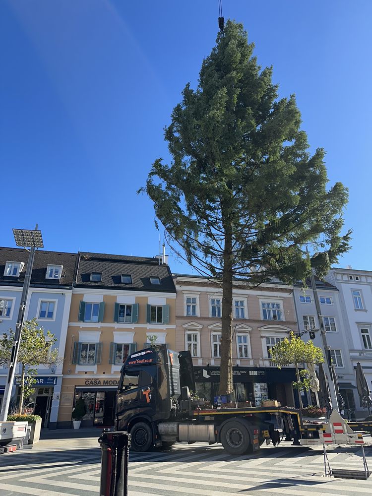 | 08.11.2025 Rathausplatz St.Pölten: Kran Krems hilft beim Weihnachtsbaum aufstellen |