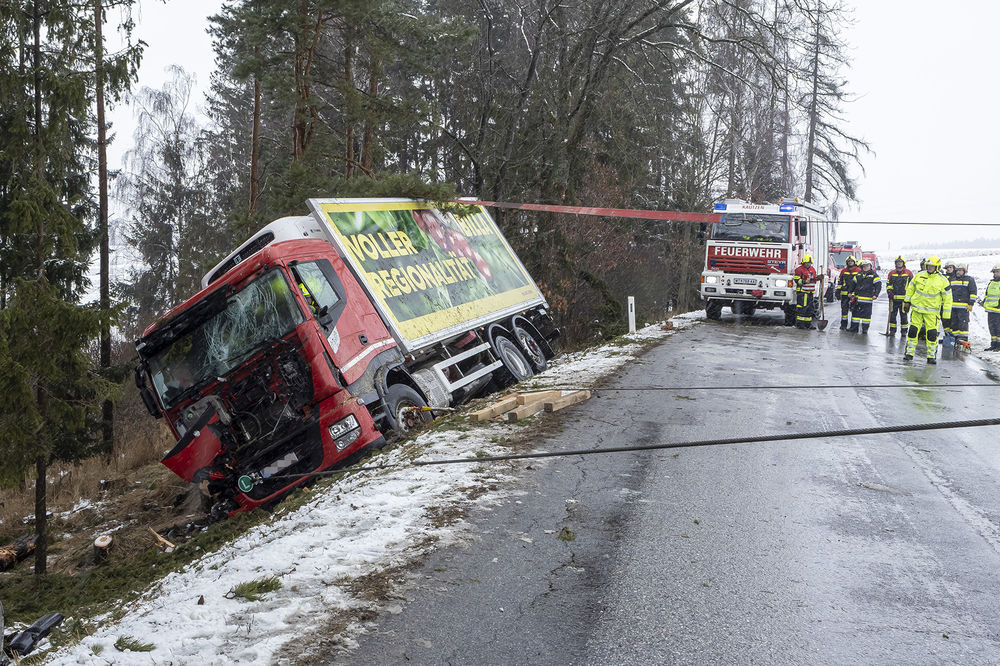 Zu einem Verkehrsunfall mit eingeklemmter Person wurden am Donnersfrüh drei Feuerwehren des Bezirkes Waidhofen an der Thaya alarmiert. Ein Lkw kam in einer abschüssigen Linkskurve rechts von der Fahrbahn ab, fällte zwei Bäume und kam in einer gefährlichen Schräglage zum Stillstand. Mehrere Bäume verhinderten einen weiteren Absturz des Schwerfahrzeuges.